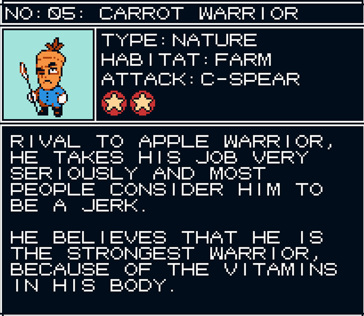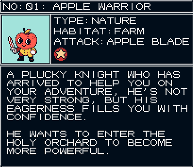 Apple Quest is a little game with big appeal, and i hate this introductory sentence. Apple Quest is a nostalgic creature-collector that manages to keep the format fresh and interesting, standing out as a legitimate title while remaining faithful to its inspirations. Like the Pocket Man games, you have a team of little monsters that you take into battle on a vaguely threatening journey, but some key differences help it to stand out. Firstly, each monster has a star rating - corresponding to its individual strength. You have a maximum star capacity of 9, and you're free to split that limit however un/evenly you want. You can have a large team of what my friend Will would affectionately call 'shitters', or a limited unit of powerful monsters. You start with the lowly 1-star Apple Warrior, weak but he is the mascot after all and you can't start with the most powerful monsters that would be ridiculous have you ever played a videogame? Never question me again. You add monsters to your bestiary by finding them on your journey through Pommeland, while also completing special quests. You are free to swap your team around at any point outside of battles. Speaking of battles...