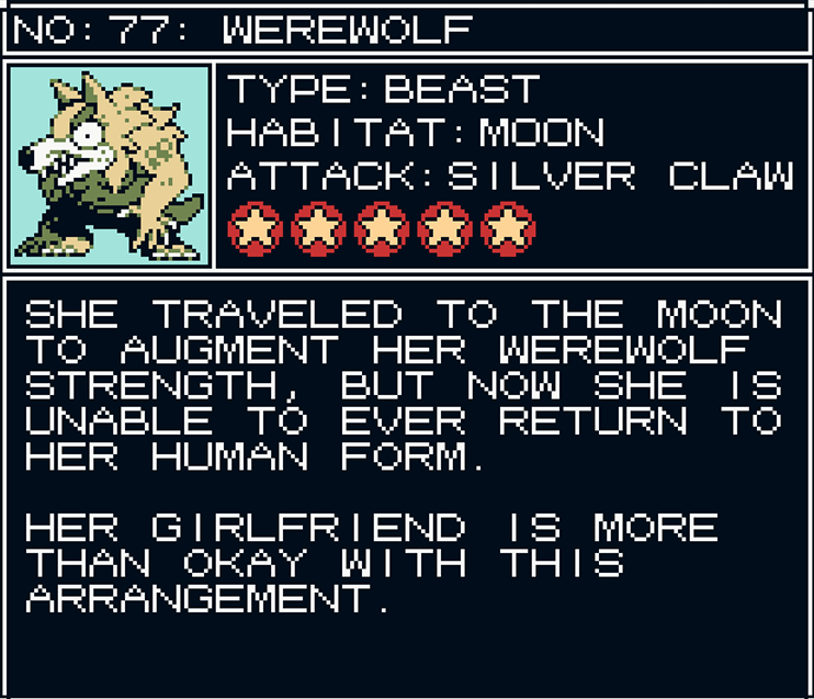 So what's going on here? Why not just make a videogame? Well, because making videogames is really hard. By existing as a game guide, Apple Quest allows its creator to present ideas for a game that would either take ages or infinity to develop. The loose presentation of these 'rules' also allows for a LOT of flexibility and imagination in the eyes of the reader, all of the gameplay systems i described earlier are completely made up by me - barring the star limit which is the only rule the 'game' explicitly presents. The genre and mechanics are completely up for debate, this is just what i envisioned while reading, you could imagine something completely different. But why even make it a fake videogame? Wouldn't an encyclopedia of Pommeland done the same job? No. The 'player' envisioning mechanics is only possible in this hyper-specific medium, a simple encyclopedia wouldn't have the same effect in fleshing out each monster and even the wider world. This format essentially tricks the 'player' into doing most of the work when it comes to imagining Pommeland as a real place - creator splendidland has done the initial legwork but it's up to us to fill in the blanks.