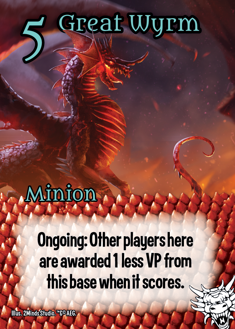 - You have 3 cards that reduce opponent's VP gained from scoring, 1 copy of Great Wyrm and 2 copies of Ruins. These are best used on bases where opponents have heavily invested, if you can turn all their hard work into a functional draw then that's a win for you.