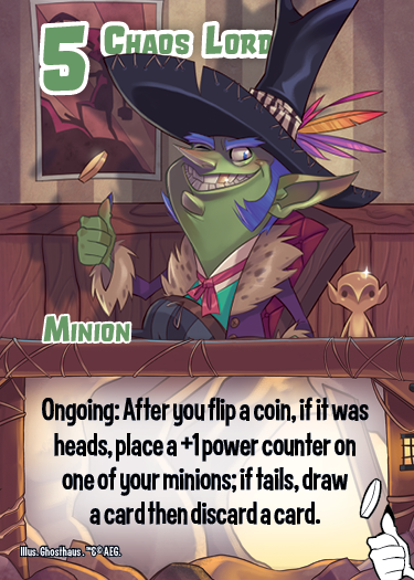 - Chaos Lord is one of those minions that you want to get out as soon as possible and have chill out on a forgotten base. Every time you flip a coin you'll get some benefit, either power on ANY of your minions or cycling through your deck by drawing and discarding cards.